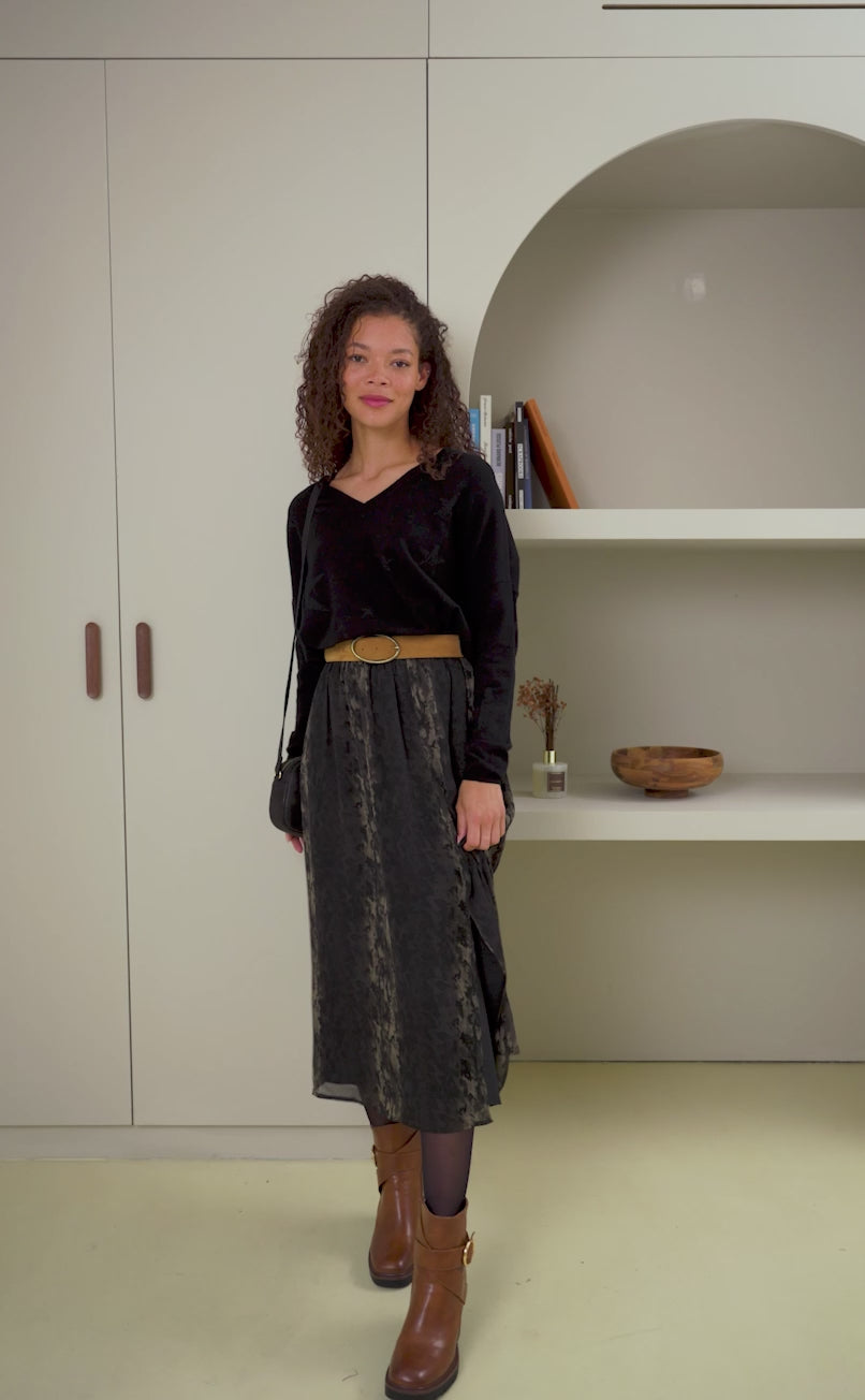 - À l’entrée de l’automne, portez-le avec un pantalon à jambe large et une veste en daim pour une allure structurée mais douce.